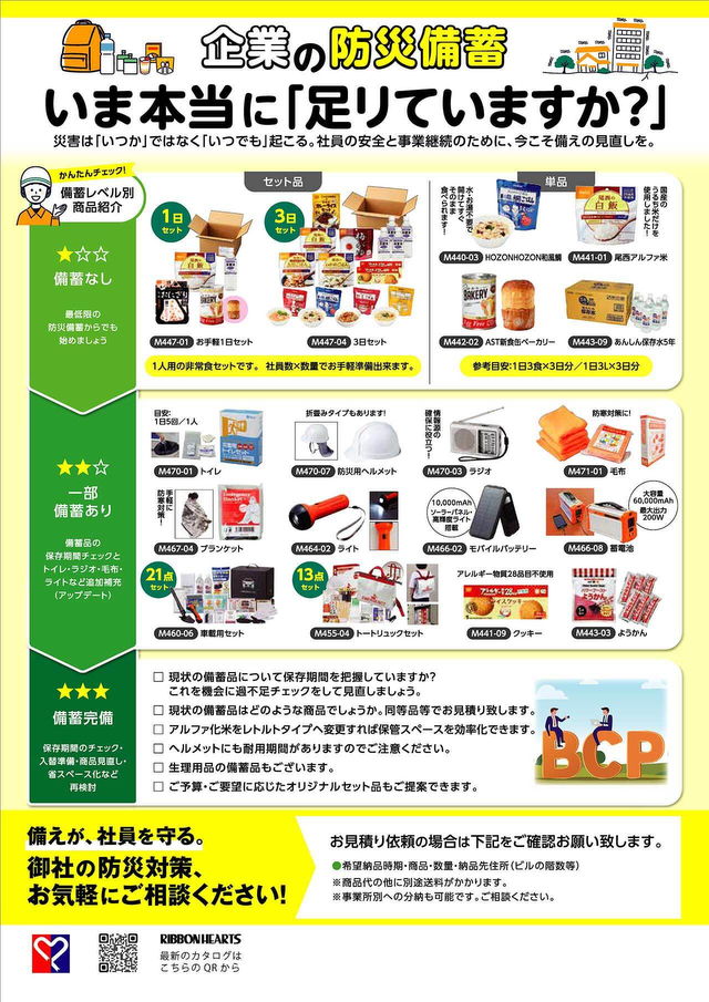 防災用品はじめ衛生用品などの供給を単なる物販ではなく、「企業の安全と従業員の生活を守るソリューション」としてご案内していきます。