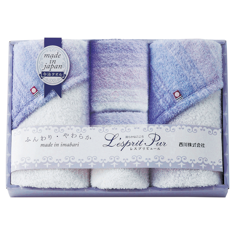 | コピー | L'esprit Pur(レスプリピュール)とはフランス語で「きよらかなこころ」を意味します。純真な想いからくる、清らかなこころのイメージを清楚なパープルグラデーションを使ってふんわりとやわらかなタオルギフトにしました。 |