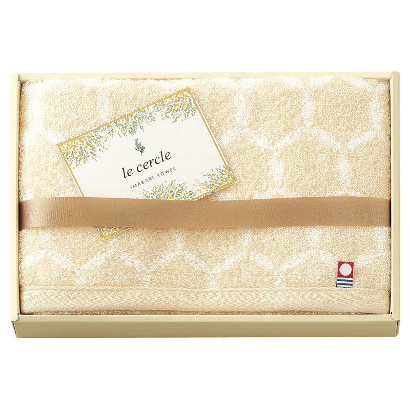 | コピー | セルクルは、フランス語で「円」を意味します。人とのつながり"縁"と「円」をかけ合わせ、繋がりながら広がってゆく様を今治産地の特徴でもあるジャカード織で表現しました。落ち着いたグリーンとあたたかみのあるベージュの色の組み合わせはどなたにも喜んでいただけます。 |