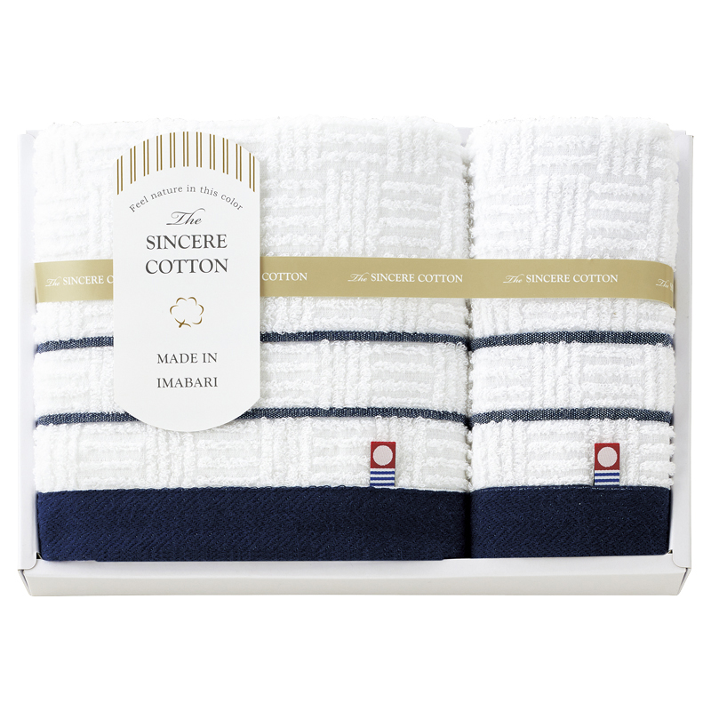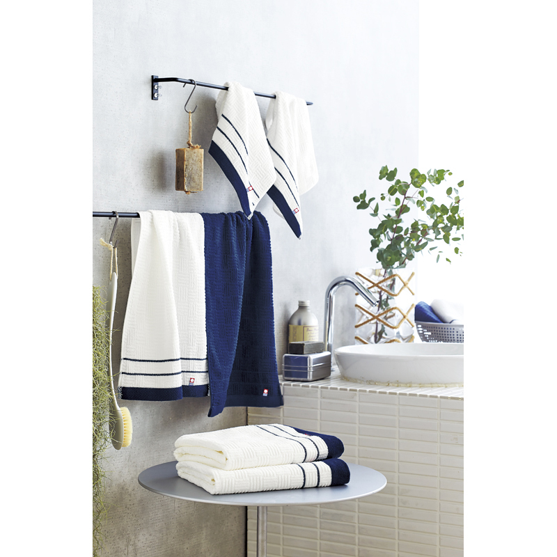 ノーブルな紺色と白色のコントラストが美しい、高級感のあるタオルです。フォーマルでも映えるシックでモダンなデザインが自慢です。