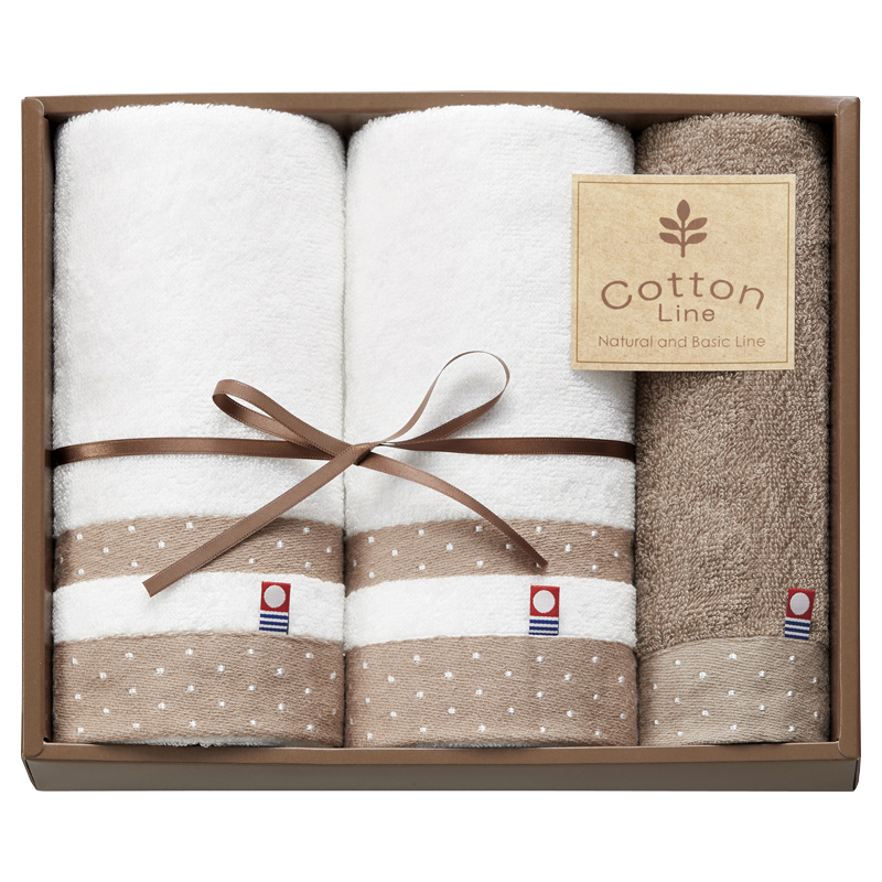 チョコレートや焼き菓子を思わせるブラウン・ベージュのナチュラルカラー。どこか懐かしく飽きることのない小さなドット模様。どなたに贈っても喜んでいただけるナチュラルカラーの今治タオルです。
