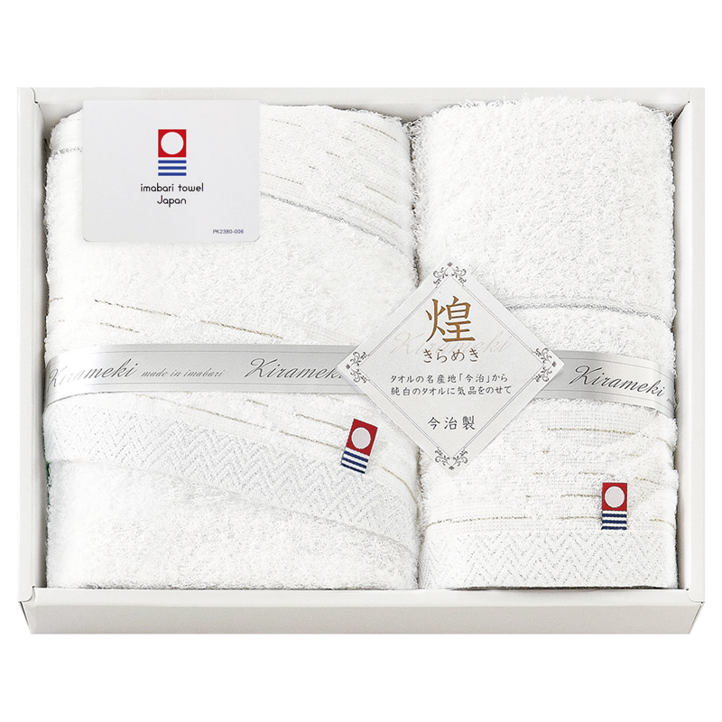 お肌になじみ、水分をしっかり吸収してくれるのでとても使いやすく贈り物に最適です。金糸・銀糸を使い、タオルの名産地「今治」から純白のタオルに気品をのせて。