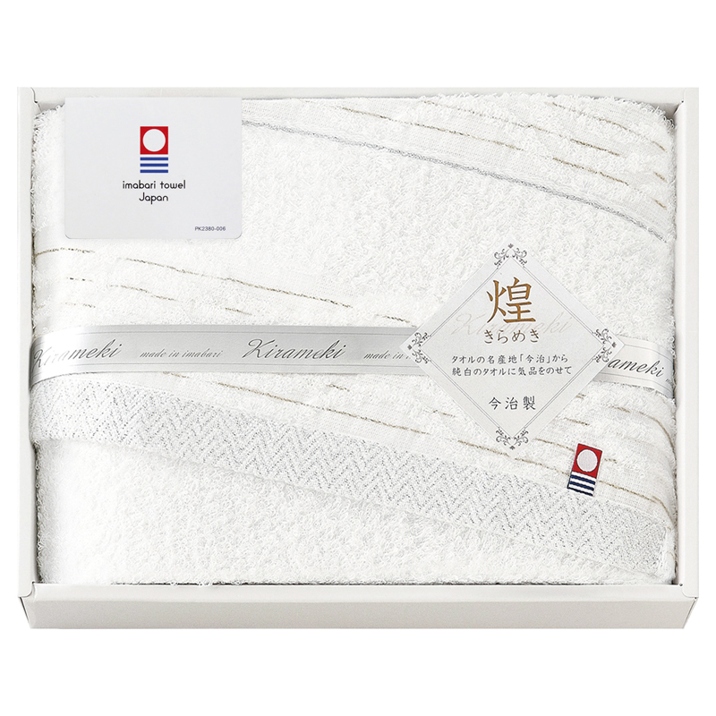 お肌になじみ、水分をしっかり吸収してくれるのでとても使いやすく贈り物に最適です。金糸・銀糸を使い、タオルの名産地「今治」から純白のタオルに気品をのせて。