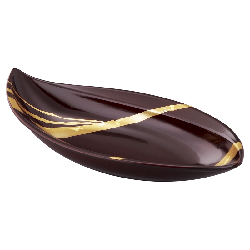 | コピー | 伝統の塗 金沢の純金箔を使った高級蒔絵漆器です。溜塗りの深みの有る塗り色と上品さが感じられる一品です。溜塗りとは下に赤色を一度塗って、その上から濃い色の焦げ茶色を重ねる技法で、深みの有る色調になります。煌びやかな金箔の金の色合いととても調和しています。 |