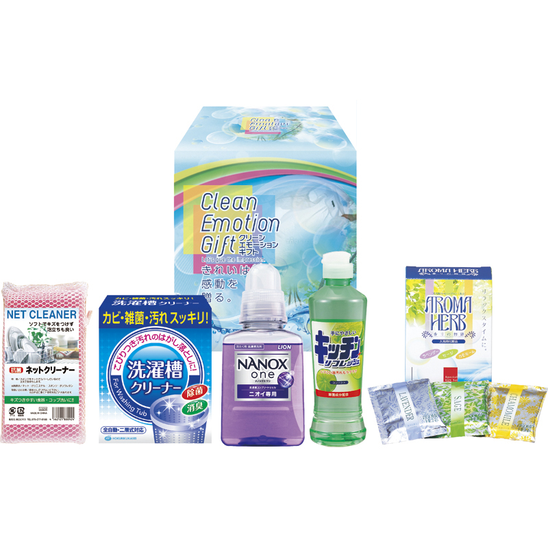 ライオンNANOX one380g・キッチンリフレッシュコンパクト270ml・洗濯槽クリーナー(50g×2包)・ハーブエキス配合入浴料(30g×3包)・ネットクリーナー×各1