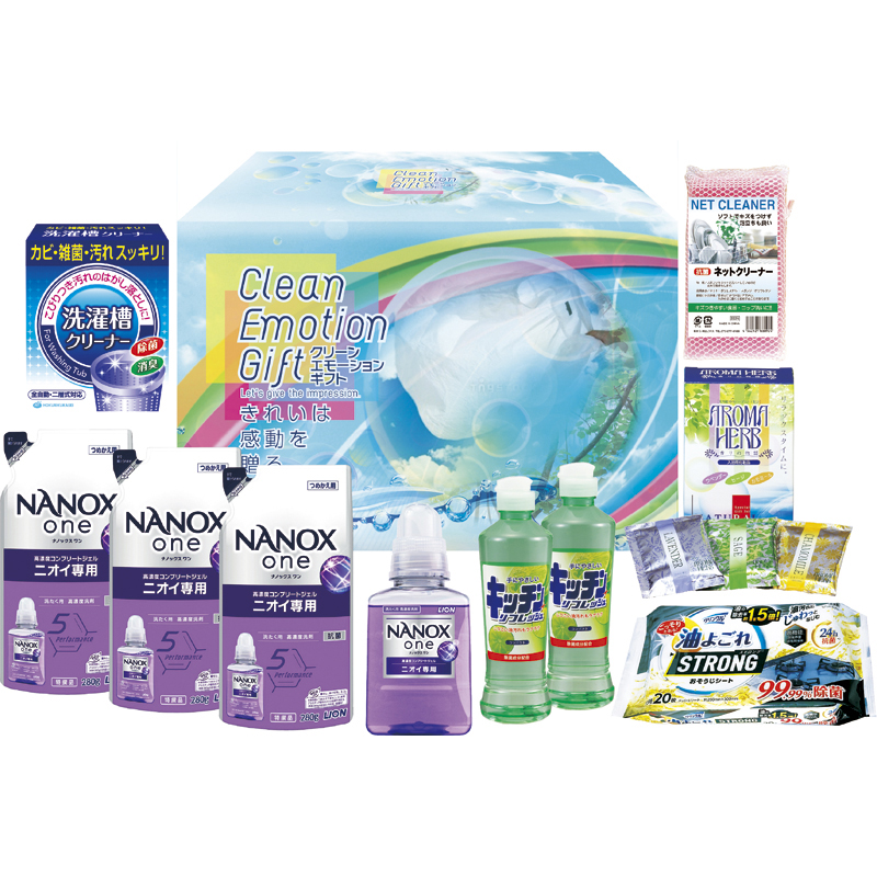 | 内容 | ライオンNANOX one380g・クリンクル油よごれおそうじシート(20枚)・ハーブエキス配合入浴料(30g×3包入)・洗濯槽クリーナー(50g×2包入)・ネットクリーナー×各1、キッチンリフレッシュコンパクト270ml×2、ライオンNANOX one 詰替用280g×3 |