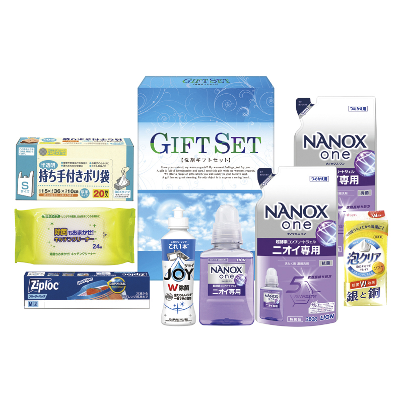 | 内容 | ライオンNANOXone380g・P&G除菌ジョイコンパクト170ml・ジップロックフリーザーバッグM3枚・持ち手付きポリ袋S20枚・キッチンクリーナー24枚・泡クリアスポンジ×各1、ライオンNANOXone詰替用280g×2 |