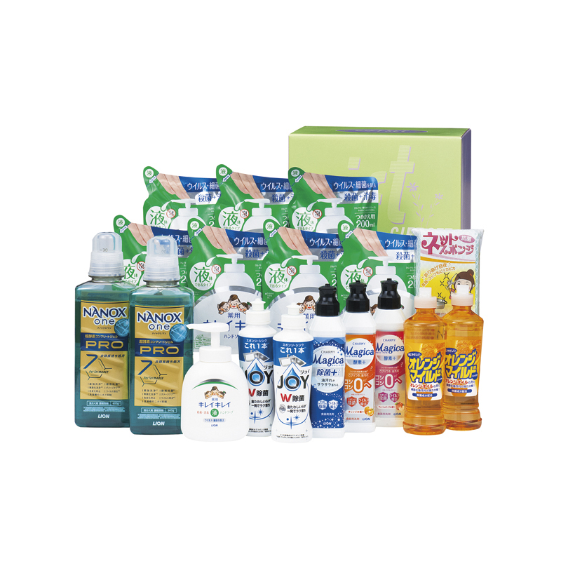 | 内容 | ライオンキレイキレイ薬用液体ハンドソープ(詰替用)200ml×7、ライオンNANOX one PRO(本体)600g・P&G除菌ジョイコンパクト170ml・オレンジマイルドコンパクト270ml×各2、ライオンCHARMY Magica除菌+220ml・ライオンCHARMY Magica酵素+オレンジの香り220ml・ライオンCHARMY Magica酵素+フレッシュピーチの香り220ml・ライオンキレイキレイ薬用液体ハンドソープ(本体)250ml・ネットスポンジ1P×各1 |
