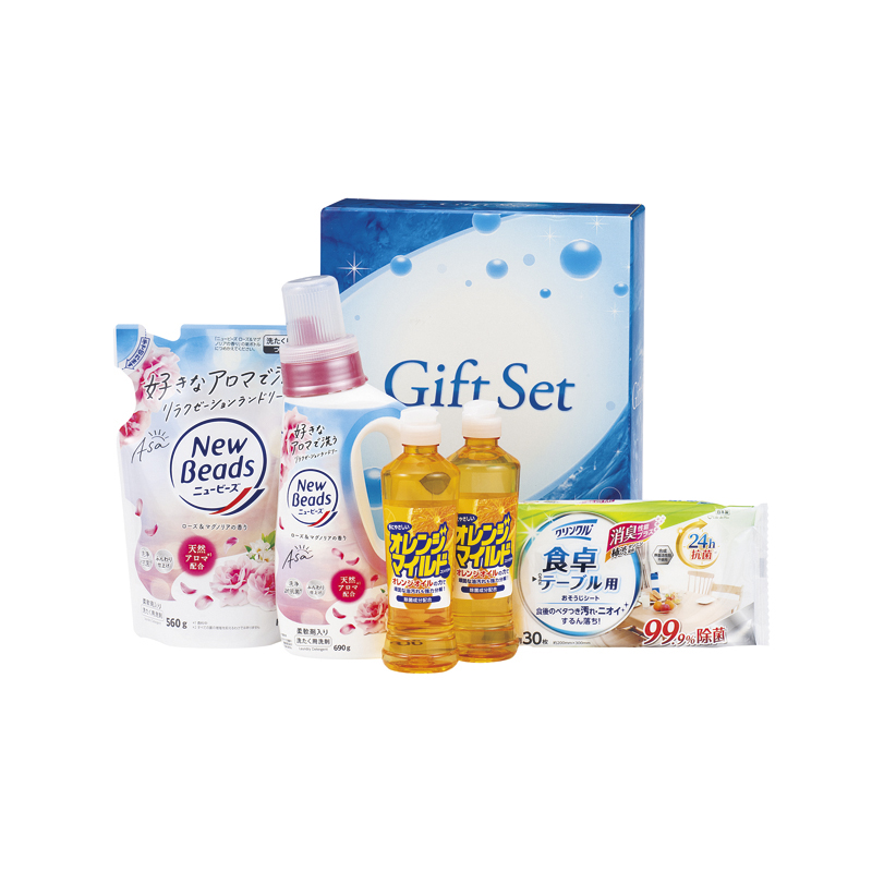 オレンジマイルドコンパクト270ml×2、花王ニュービーズローズ&マグノリアの香り(本体)690g・花王ニュービーズローズ&マグノリアの香り(詰替用)560g・クリンクル食卓テーブル用シート30枚入×各1