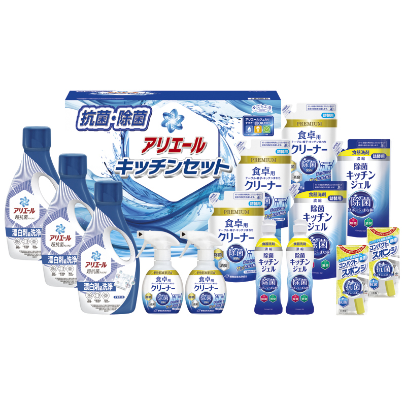 | 内容 | P&Gアリエールジェル700g・食卓用クリーナー(詰替)250ml×各3、除菌キッチンジェル200ml・除菌キッチンジェル(詰替)160ml・食卓用クリーナー260ml・コンパクトスポンジ×各2 |