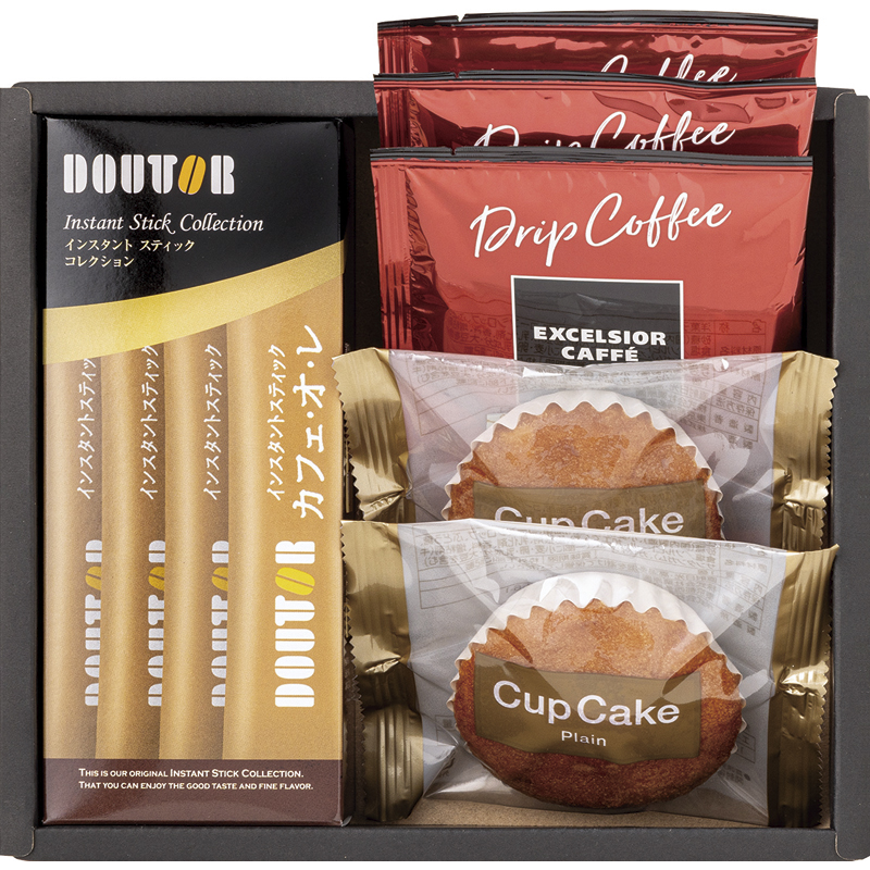 | 内容 | エクセルシオールカフェドリップコーヒー(モカブレンド8g)×3、カップケーキ(プレーン)×2、ドトールインスタントスティックカフェオレ(9.5g×4本入)×1 |