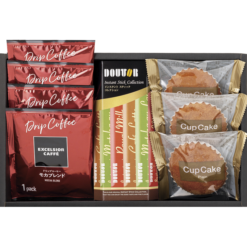 | 内容 | エクセルシオールカフェドリップコーヒー(モカブレンド8g)×4、カップケーキ(プレーン)×3、ドトールインスタントスティック(抹茶オレ11g・カフェラテ14g・ロイヤルミルクティー15g×各2本入)×1 |