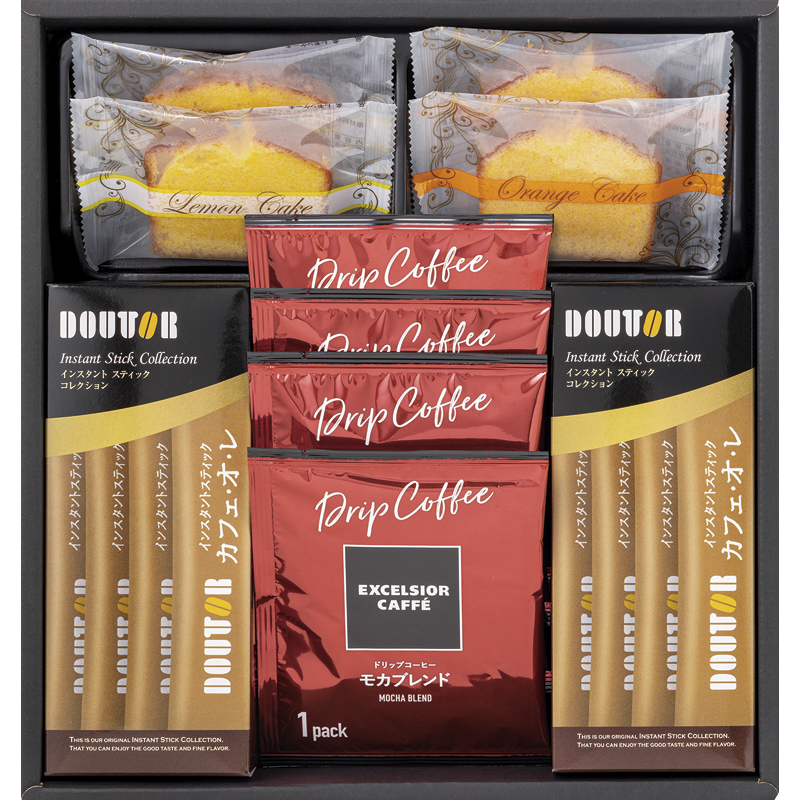 | 内容 | エクセルシオールカフェドリップコーヒー(モカブレンド8g)×4、ドトールインスタントスティックカフェオレ(9.5g×4本入)・カットケーキ(レモン・オレンジ)×各2 |