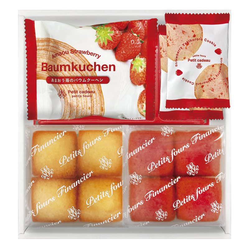 | 内容 | あまおう苺バウムクーヘン・プチフィナンシェ4個入(あまおう苺・プレーン)×各1、焼きほろろクッキー(イチゴ)×2 |