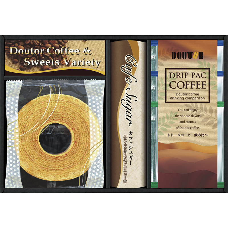 | 内容 | ミルクバウムクーヘン・ドトールドリップコーヒー(キリマンジャロブレンド7g)×各1、ドトールドリップコーヒー(深煎りブレンド7g)×2、スティックシュガー3g×5 |