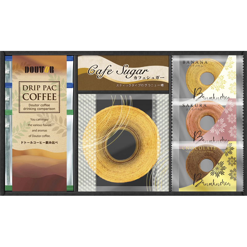 | 内容 | ミルクバウムクーヘン・ドトールドリップコーヒー(キリマンジャロブレンド7g)・ミニバウムクーヘン(バナナ・桜・ベルギーショコラ)×各1、ドトールドリップコーヒー(深煎りブレンド7g)×2、スティックシュガー3g×5 |