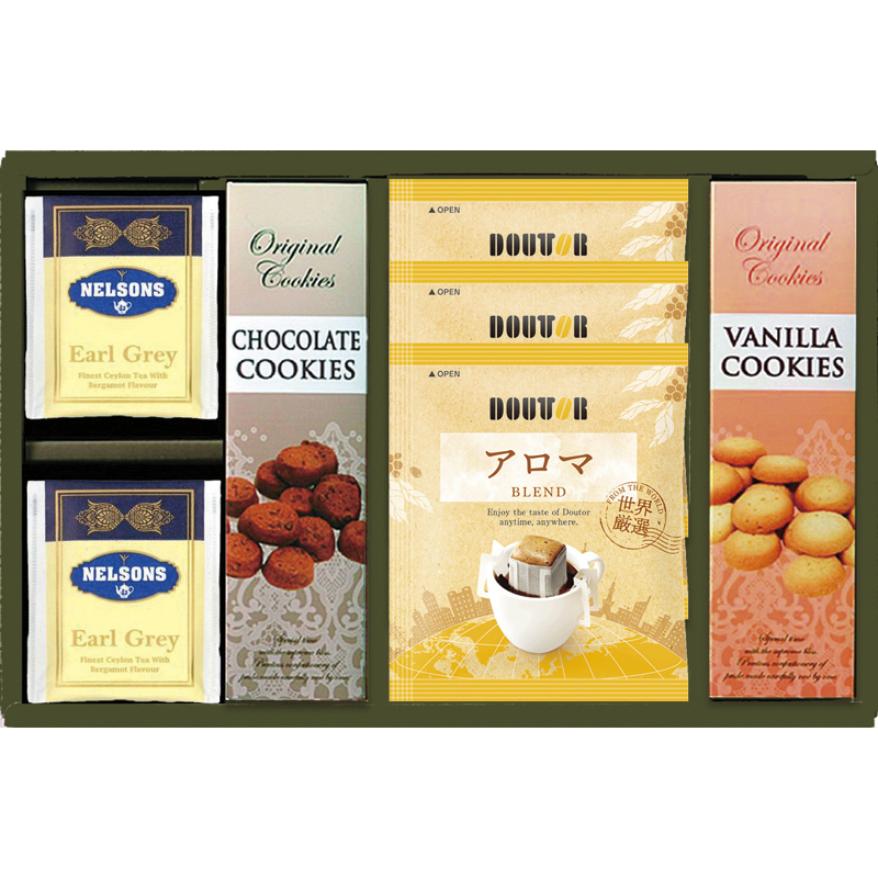 ドトールドリップコーヒーアロマブレンド7g×3、アールグレイ紅茶ティーバッグ(NELSONS)2g×12、チョコクッキー30g・バニラクッキー30g×各1