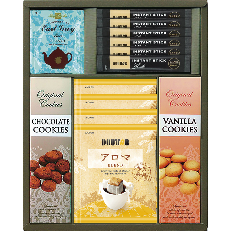ドトールドリップコーヒーアロマブレンド7g×4、ドトールインスタントスティックコーヒー(ブラック)2g×6、アールグレイ紅茶ティーバッグ2g×5、チョコクッキー30g・バニラクッキー30g×各1