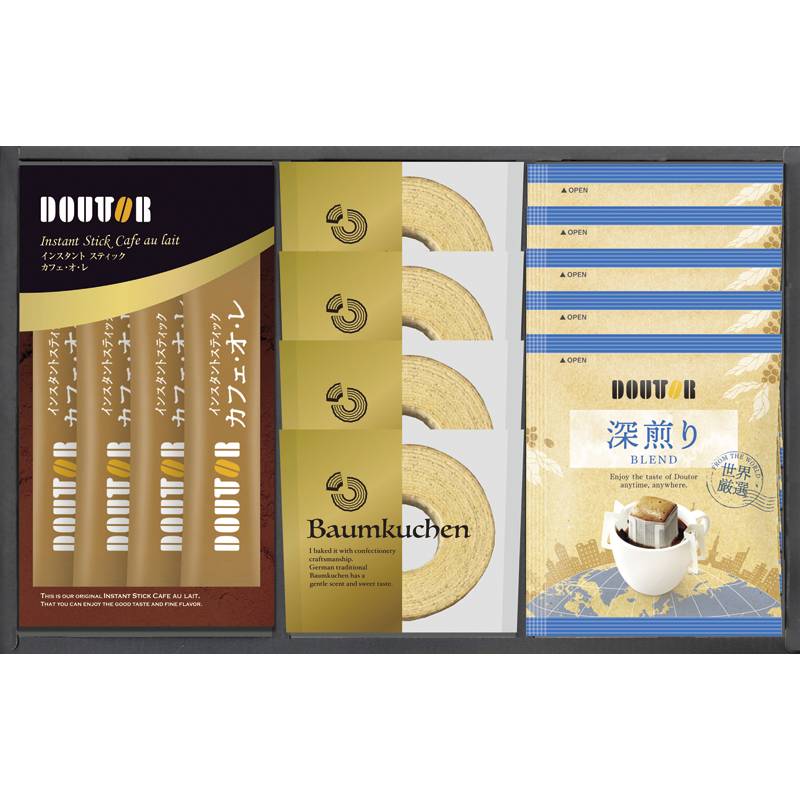 バウムクーヘン・ドトールカフェ・オ・レ9.5g×各4、ドトールドリップコーヒー深煎りブレンド7g×5