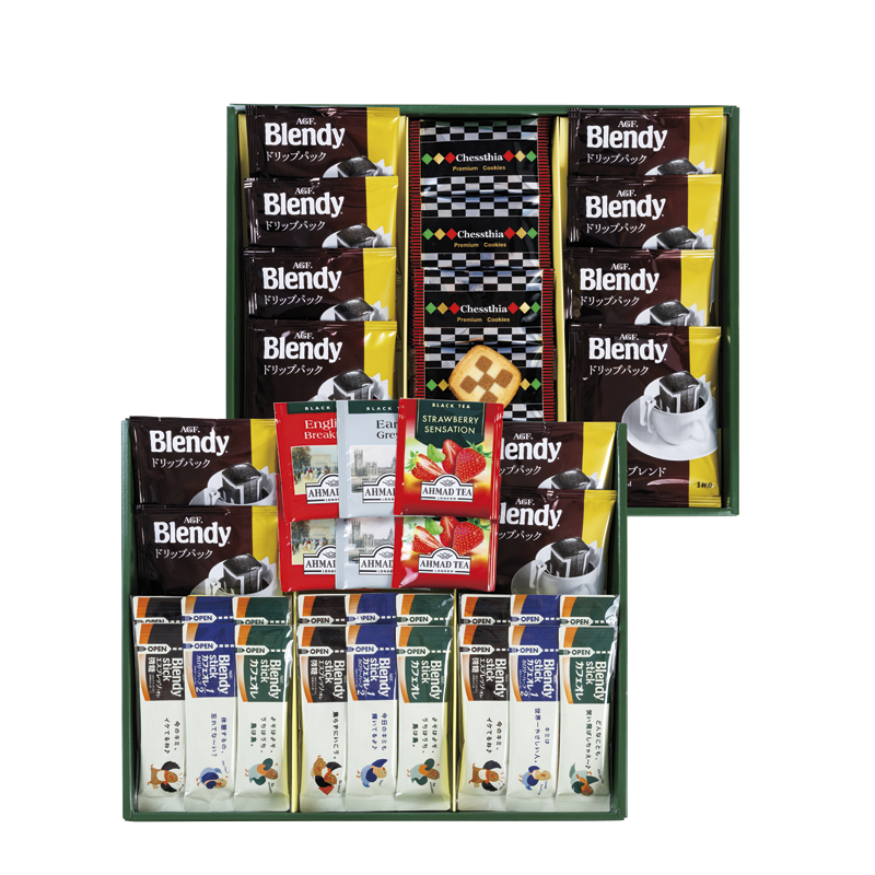 | 内容 | チェスティアクッキー×15、AGFブレンディコーヒードリップ式7g×12、紅茶(アールグレイ・イングリッシュブレックファースト・ストロベリー)2g×各2、AGFブレンディスティック(エスプレッソオレ5.8g・カフェオレハーフ5.4g・カフェオレ8.2g)×各6 |