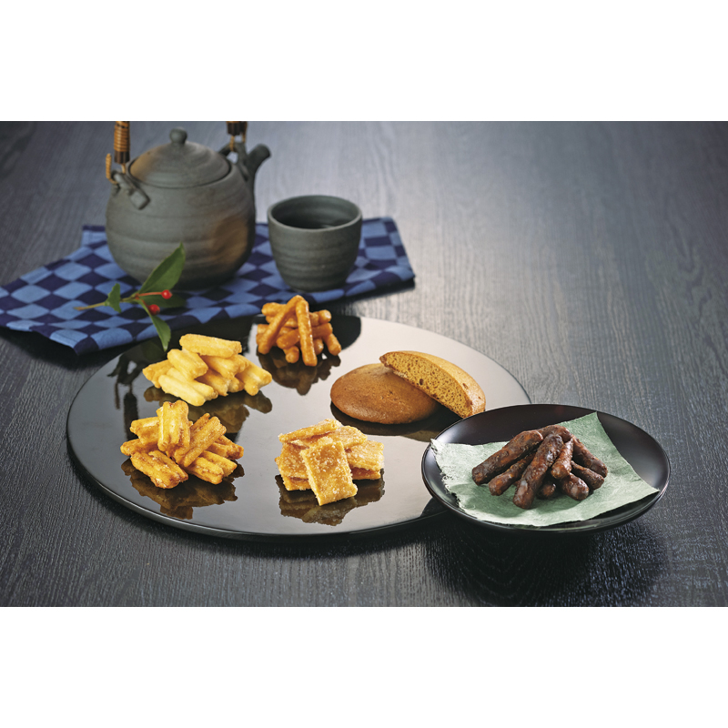 | 内容 | 黒糖丸ぼうろ×4、揚げ餅(しお味・しょうゆ味)20g・かりんとう(さつまいも・黒糖)40g・ざらめ千枚40g×各1 |