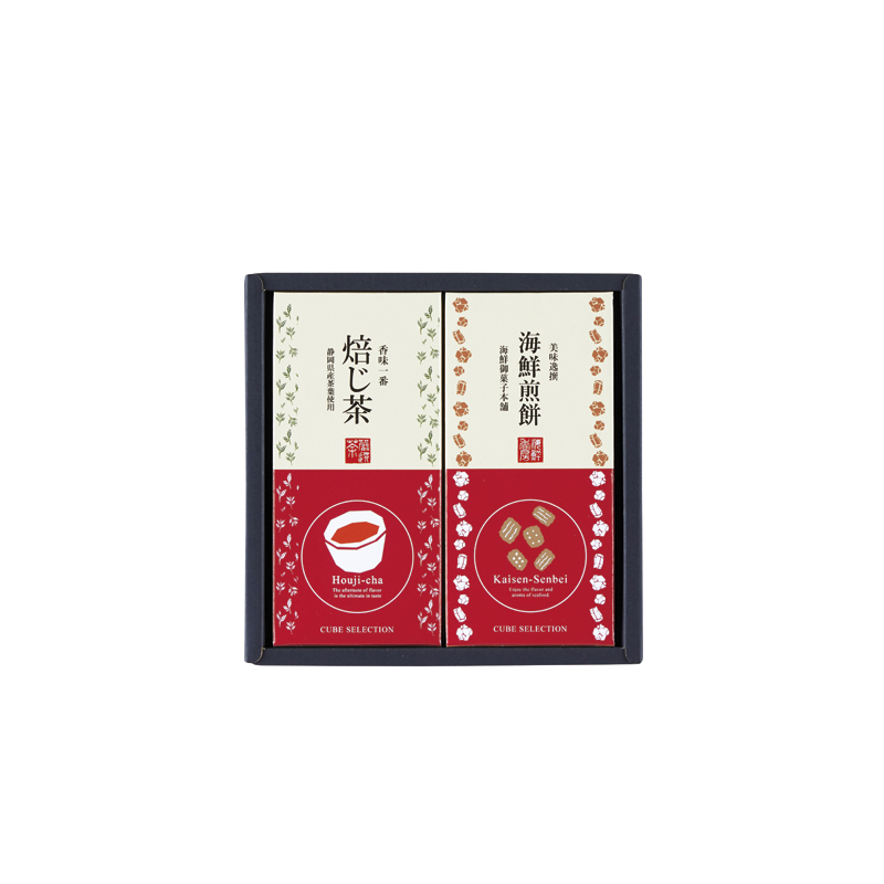 甘香ばしいほうじ茶や、煎茶とお茶請けの詰め合わせです。お茶は茶処静岡より丹精込めてお送りします。コロンと可愛いキューブ型。開けたらワクワク楽しいパッケージです。