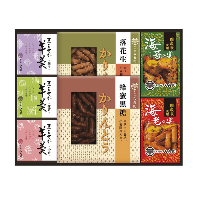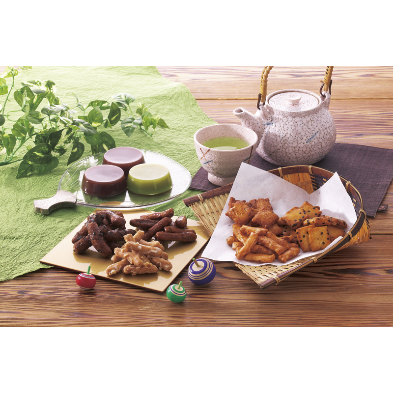 昔ながらの素朴な味のかりんとう、夏でも冬でも楽しめるまろやか羊かん、国産米だけで作ったあられなどを詰合せました。