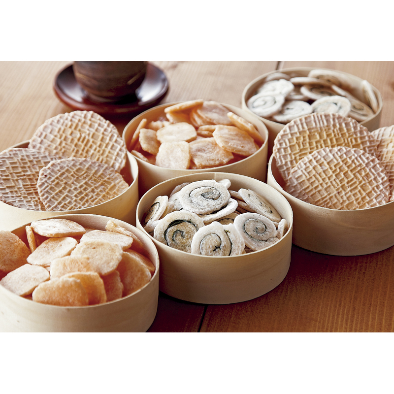 赤えびを使用し焼き上げた、ヘルシー志向でノンフライ製法のおせんべい。二度焼き製法で優しい食感に作ったうず巻・えび松風。えびせんべいの原料として最適な海老を使用しこだわりの製法で仕上げました。
