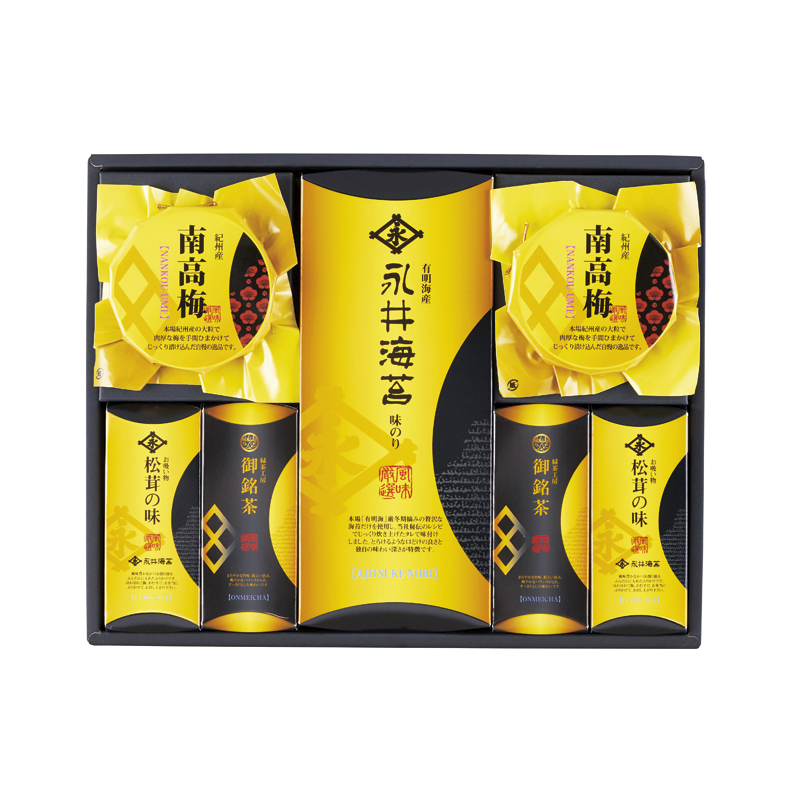 永井海苔 味付海苔(8切6枚×2)×1、永井海苔 お吸い物(松茸風味)(3.3g×2)・紀州南高梅100g・深蒸し茶40g×各2