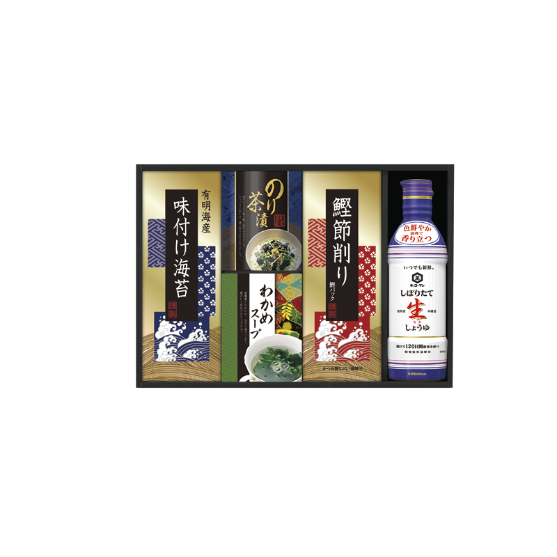 キッコーマンしぼりたて生しょうゆ450ml・有明海産味付け海苔(3切4枚)・のり茶漬け(4.3g×2)・わかめスープ(5.3g×2)・鰹節削り(2g×4)×各1