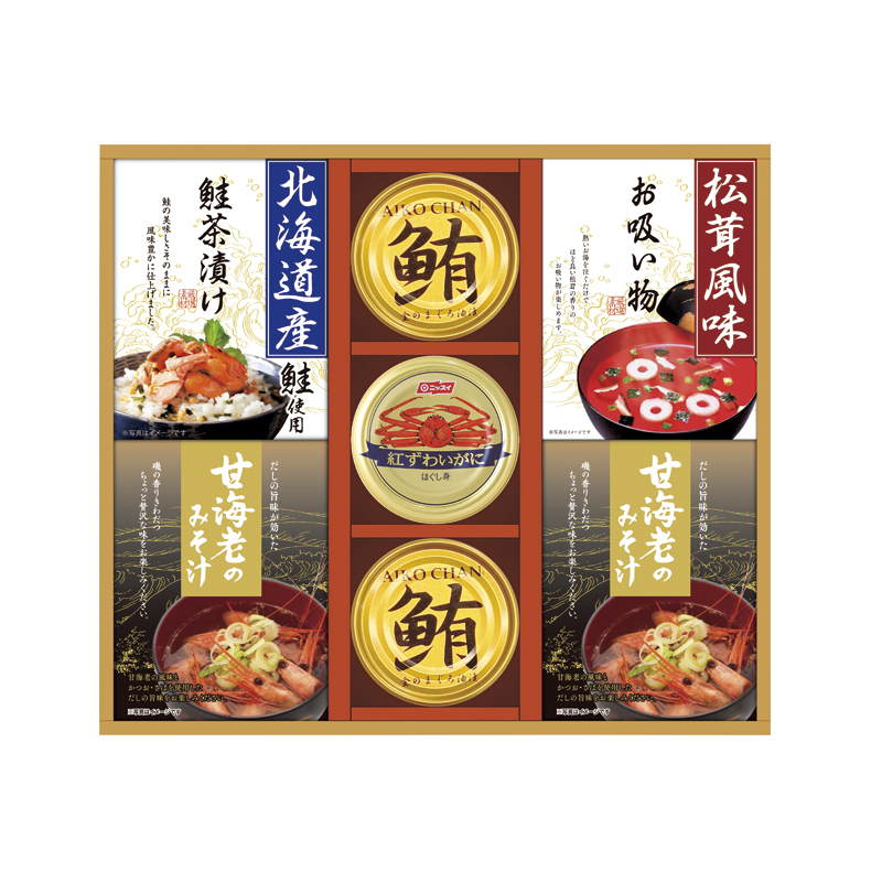 甘海老みそ汁(7.5g×3)・鮪油漬フレーク70g×各2、北海道産鮭茶漬け(4g×3)・永谷園松茸風味お吸い物(2.3g×4)・紅ずわいがにほぐし身55g×各1
