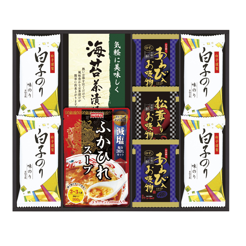 | 内容 | ふかひれスープ160g・松茸入りお吸い物4.2g・丸美屋のり茶漬け(6g×2)×各1、あわび入お吸い物4g×2、白子のり(8切5枚)×4 |