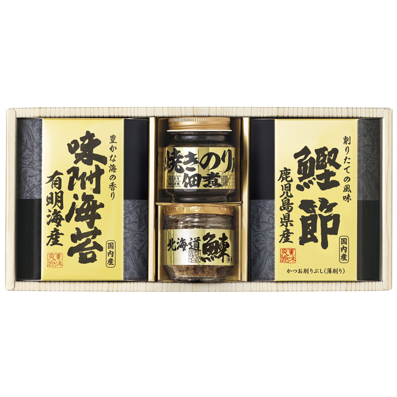 北海道産鰊フレーク50g・焼きのり佃煮85g・鹿児島県産鰹節(2g×3)・有明海産味附海苔(8切10枚)×各1