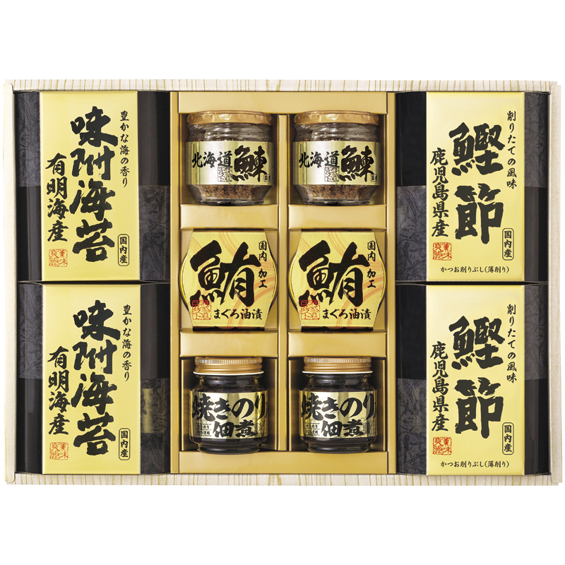 | 内容 | 北海道産鰊フレーク50g・焼きのり佃煮85g・鹿児島県産鰹節(2g×3)・有明海産味附海苔(8切10枚)・まぐろ油漬け70g×各2 |