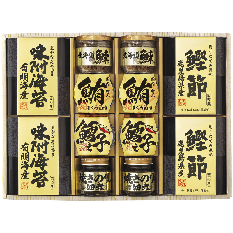 | 内容 | 北海道産鰊フレーク50g・焼きのり佃煮85g・鹿児島県産鰹節(2g×3)・有明海産味附海苔(8切10枚)・まぐろ油漬け70g・鱈之子味付け70g×各2 |