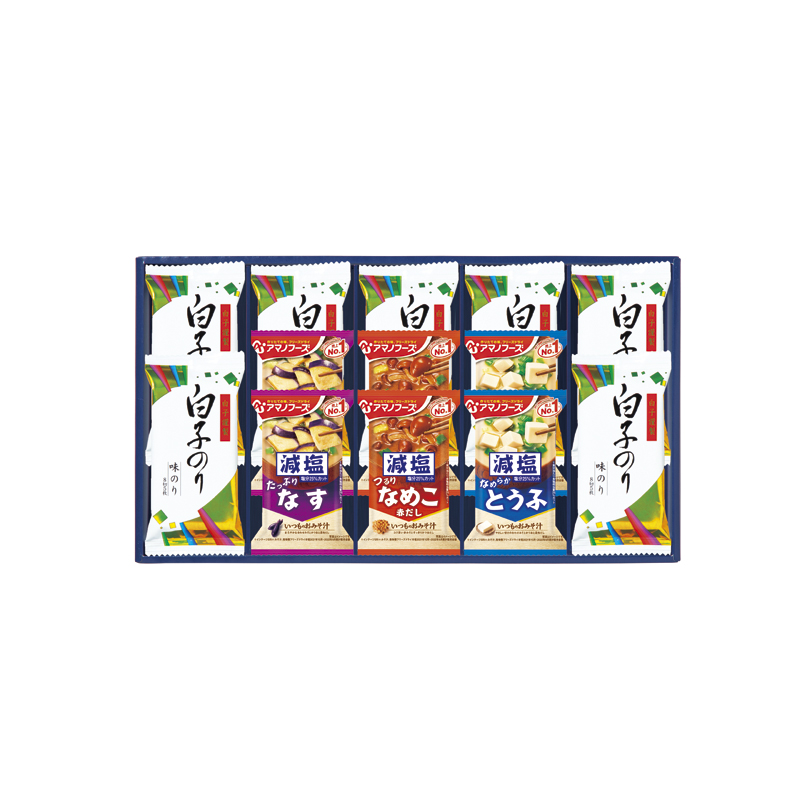 アマノフーズの減塩タイプみそ汁と白子のり味のりを詰合せました。