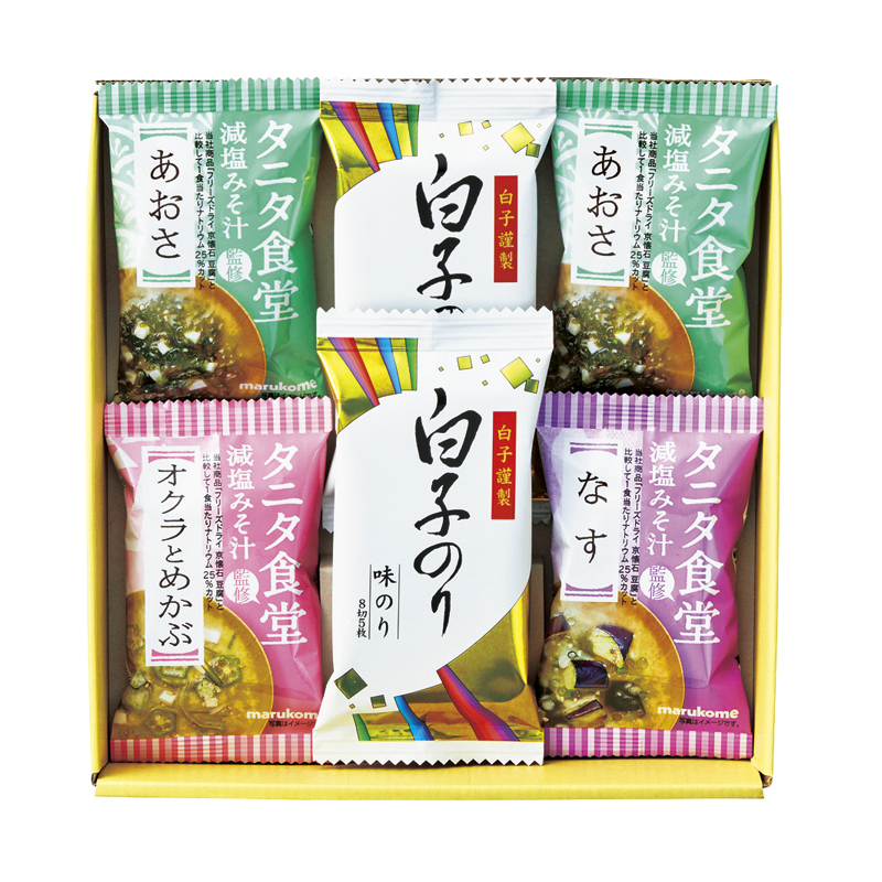 | 内容 | タニタ食堂監修減塩みそ汁(あおさ)・白子のり味のり(8切5枚)×各2、タニタ食堂監修減塩みそ汁(オクラとめかぶ・なす)×各1 |