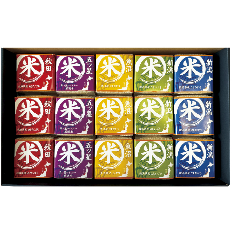 | 内容 | 新潟県産コシヒカリ150g・新潟県産こしいぶき150g・秋田県産あきたこまち150g・ブレンド米150g・魚沼産コシヒカリ150g×各3 |