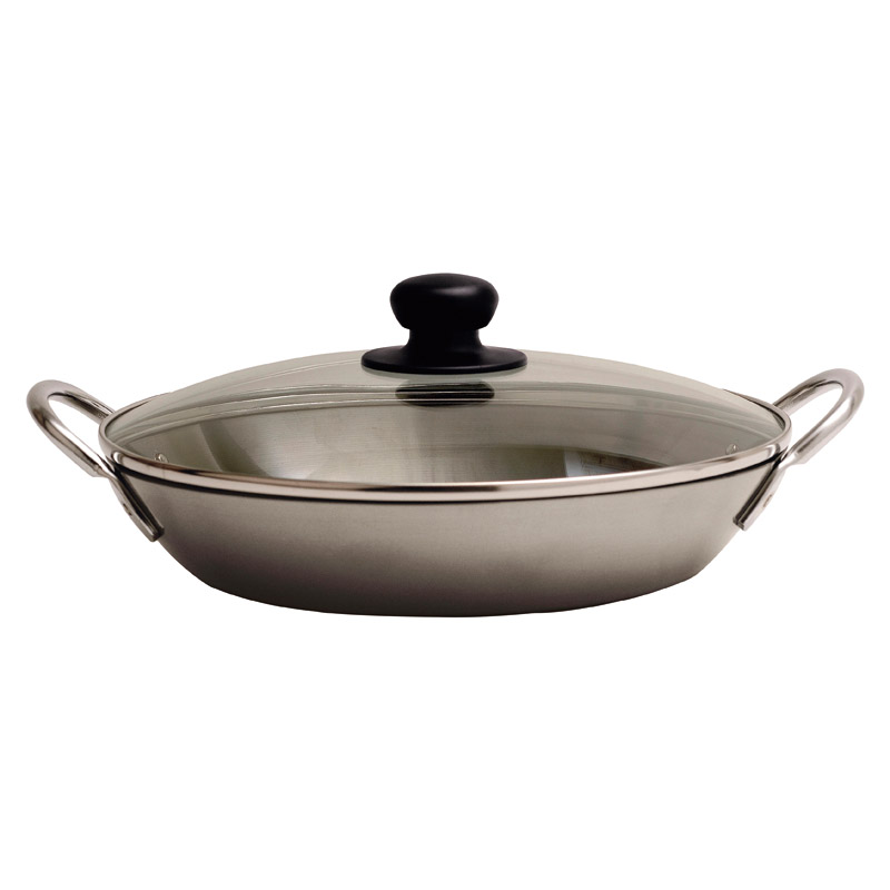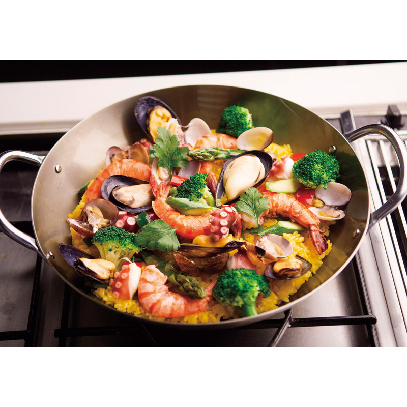 | コピー | 予熱したり、強火を扱うハードな調理に最適の鉄製パエリア鍋です。一般のパエリア鍋よりも深めで調理が楽です。そのまま卓上にも出せ、調理、蒸らしに便利なガラス蓋付き。両手フライパンとして、焼物などにもお使い頂けます。 |