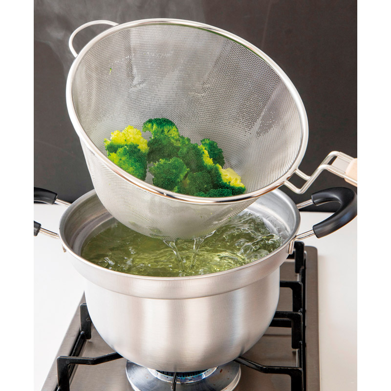 | コピー | 熱回りのいいステンレスの両手鍋に、握りやすい木柄付きのザルがセットされています。鍋にザルを入れた状態で茹でれば、タイミングを逃すことなく引き上げることができます。また、鍋本来の機能も秀逸です。本体上部につけた段と曲線を描く構造の合せ技で吹きこぼれにくく、煮物などにも重宝すること間違いありません。 |