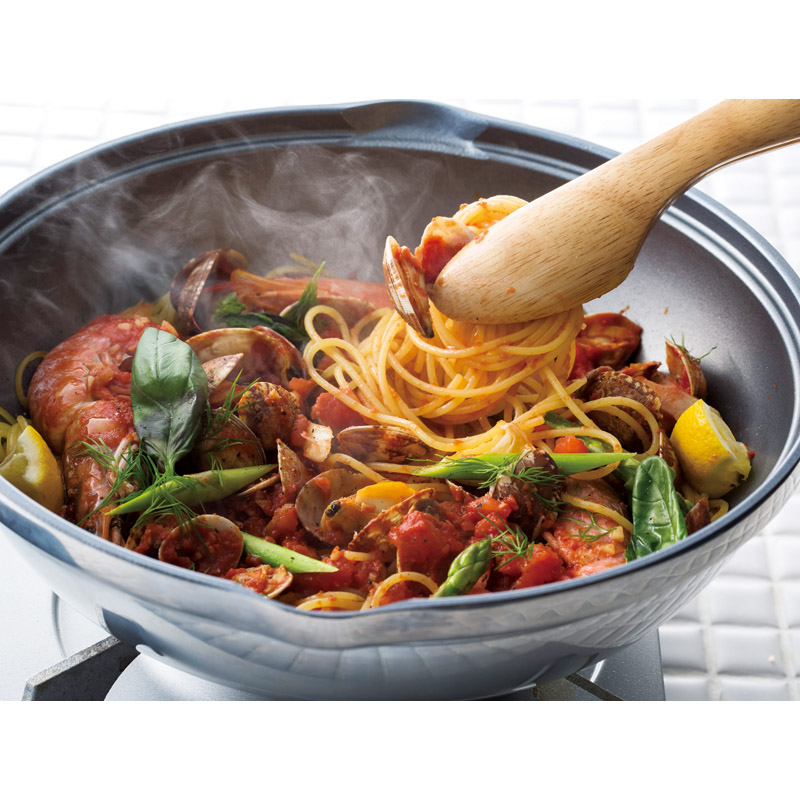 | コピー | 無水調理のできるフライパン。ふっ素加工で、料理もお手入れも簡単に。短時間で鍋底だけでなく側面まで、鍋全体にゆきわたる均一な火通りで、焼き物や炒め物がIHでもガスに負けない仕上がりに。これ一つでオールマイティに使える、毎日に欠かせなくなる万能無水鍋です。 |