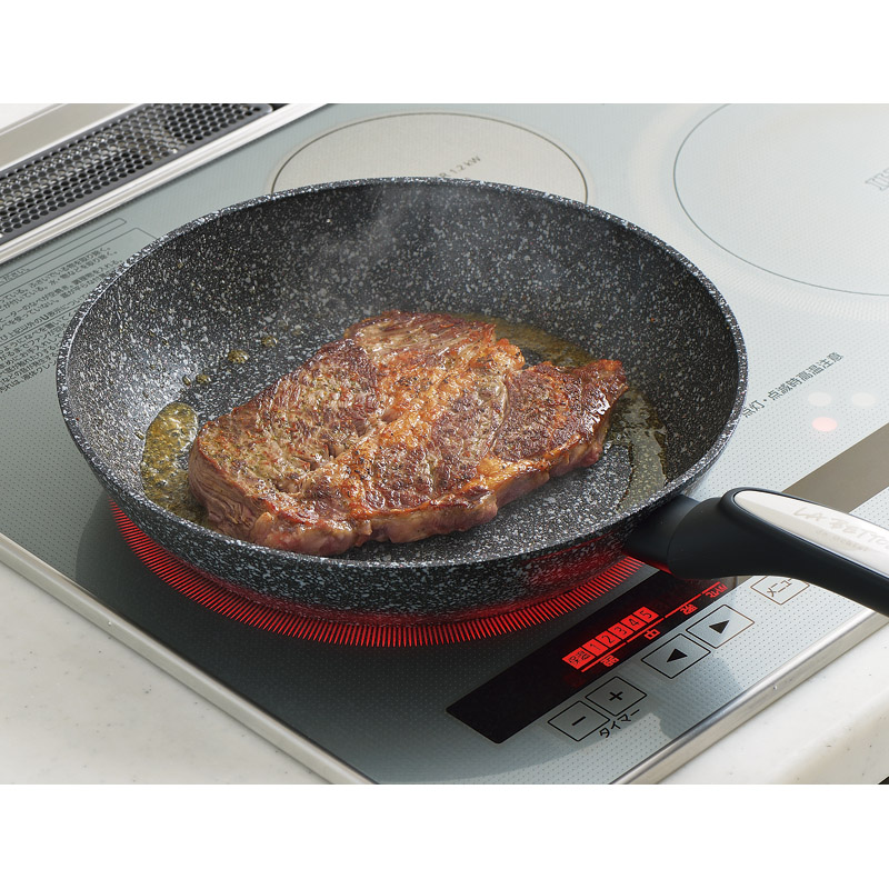 | コピー | ブラックのベースコートにシルバーと赤のマーブル模様を散りばめて…4層マーブルフッ素で焦げ付きにくさが長持ちします。耐摩耗テスト100万回クリア!!普段使いに便利なミドルサイズのフライパン。 |