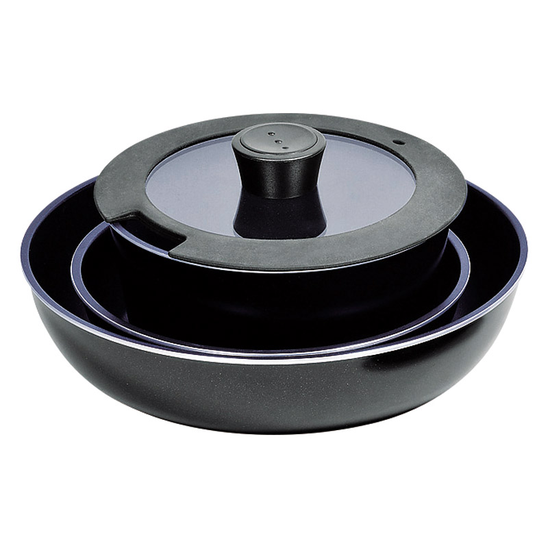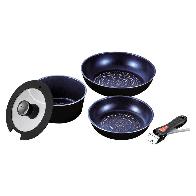 | 内容 | マルチポット18㎝(約φ190×85㎜)・フライパン20㎝(約φ215×50㎜)・フライパン26㎝(約270×60㎜)・着脱ハンドル・ガラス蓋×各1 |