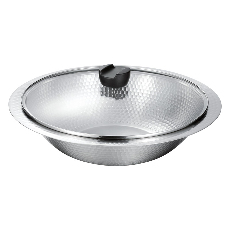| コピー | ステンレスの一枚板からプレスして作り出されたシンプルな鍋。取っ手代わりになる広めのフチで見た目もすっきり。鍋料理の他、大皿としても使えます。ガラス蓋の取っ手にツールを一時置きすることができます。 |
