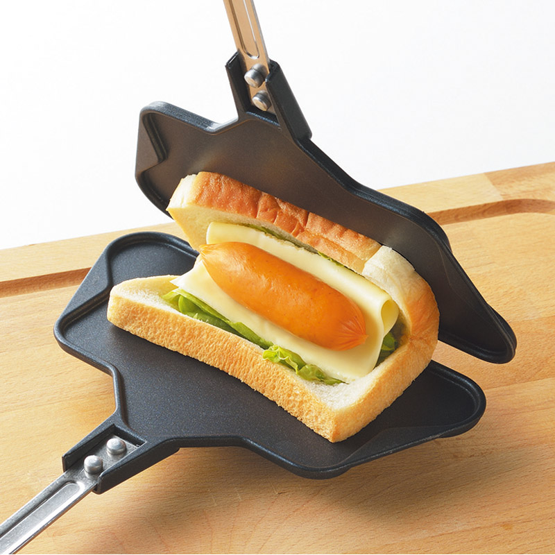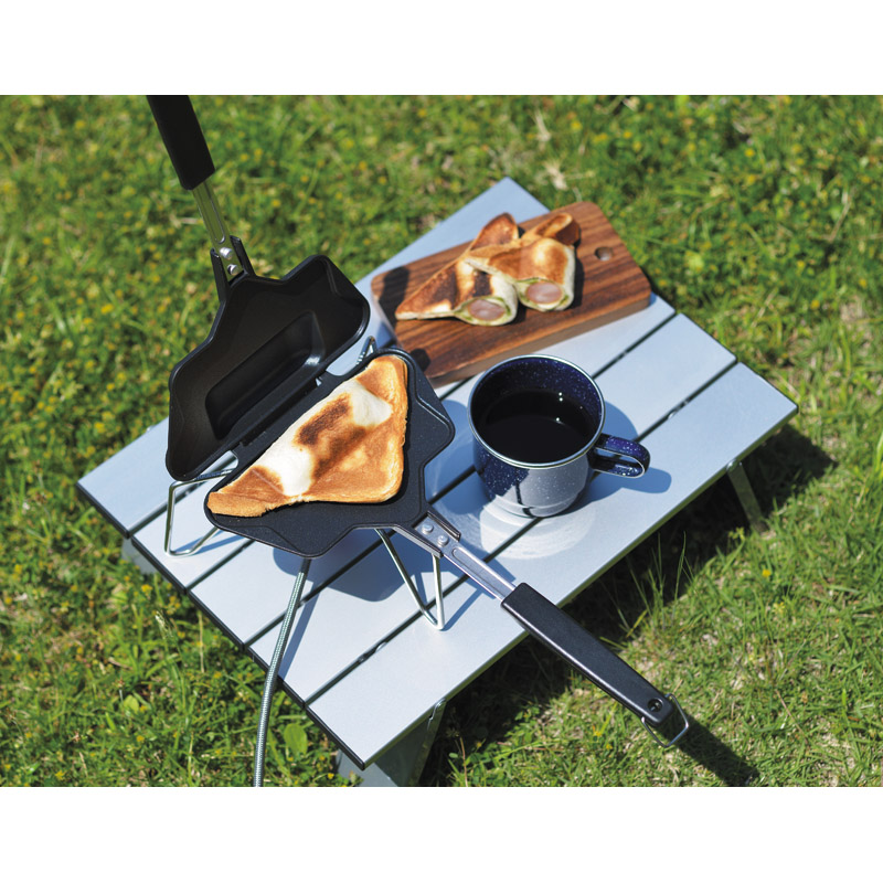| コピー | 食パン1枚で焼ける。お手軽ホットサンドメーカー。アルミニウム合金で軽量タイプ。フッ素樹脂加工でお手入れ簡単。横向きに挟んで焼けば、具がたっぷり入る長方形型に。ナナメに挟んで焼くと、耳がサックリ。三角形のホットサンドに。ガス火専用。 |
