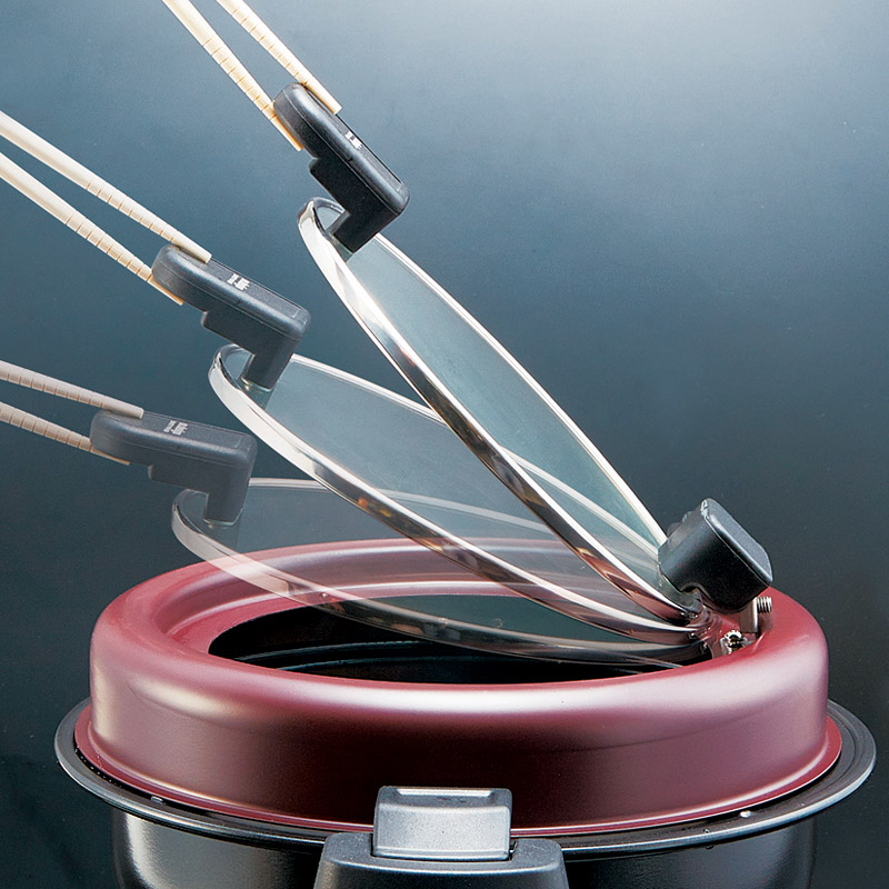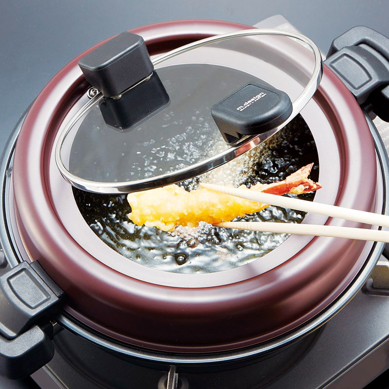 | コピー | 水分の多い冷凍食品、イカやエビなど調理中の油ハネをガラス窓付フードがガード!コンロ周りもきれいに保ちます。鍋、フードが別々になって洗浄しやすい。 |
