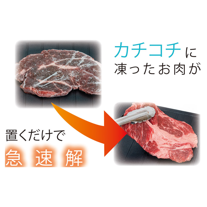 | コピー | 冷凍した食材を置くだけで急速解凍できるプレートです。脚付で本体が浮くので取りやすく、出た水分が溝にたまる構造なので食材に余分な水分が付きにくいです。アルミの高い熱伝導性を使って解凍やお弁当を素早く覚ます放熱にも活躍。素早い自然解凍・粗熱とりができるので電気やガスを使わず節約にもなります。お手入れしやすいフッ素樹脂加工が施され衛生的にも安心です。食洗機OK。 |