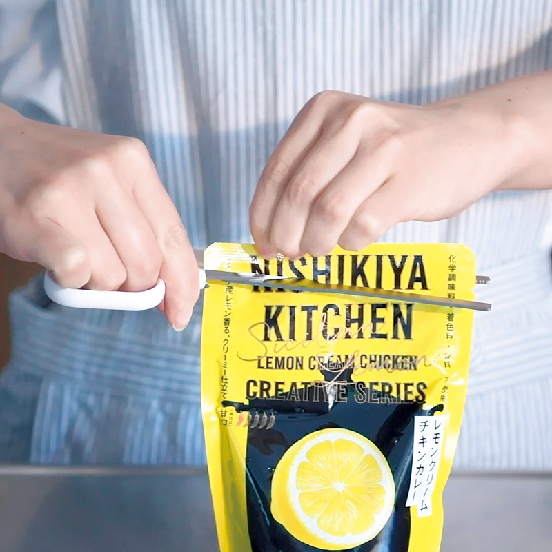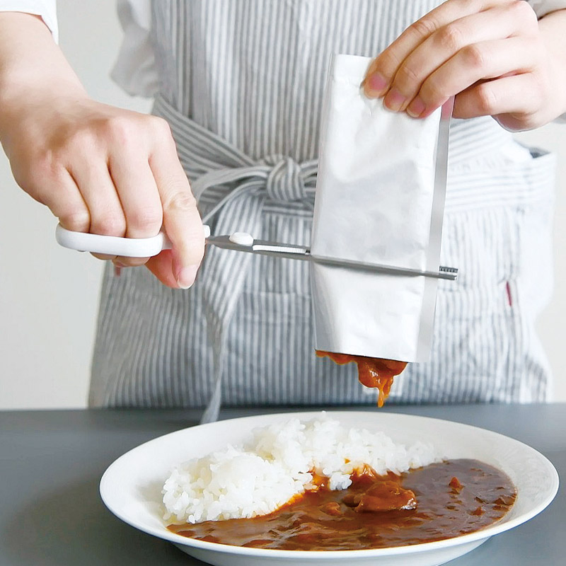 1本で「つかむ、きる、しぼる」ができる、レトルト食品のお悩みを解決する多機能ハサミ。パウチをつかむ時「熱くて危険」・パウチを切る時「中身が飛び散る」・パウチの「中身が完全にしぼり出せない」これらを全て解決してくれます。