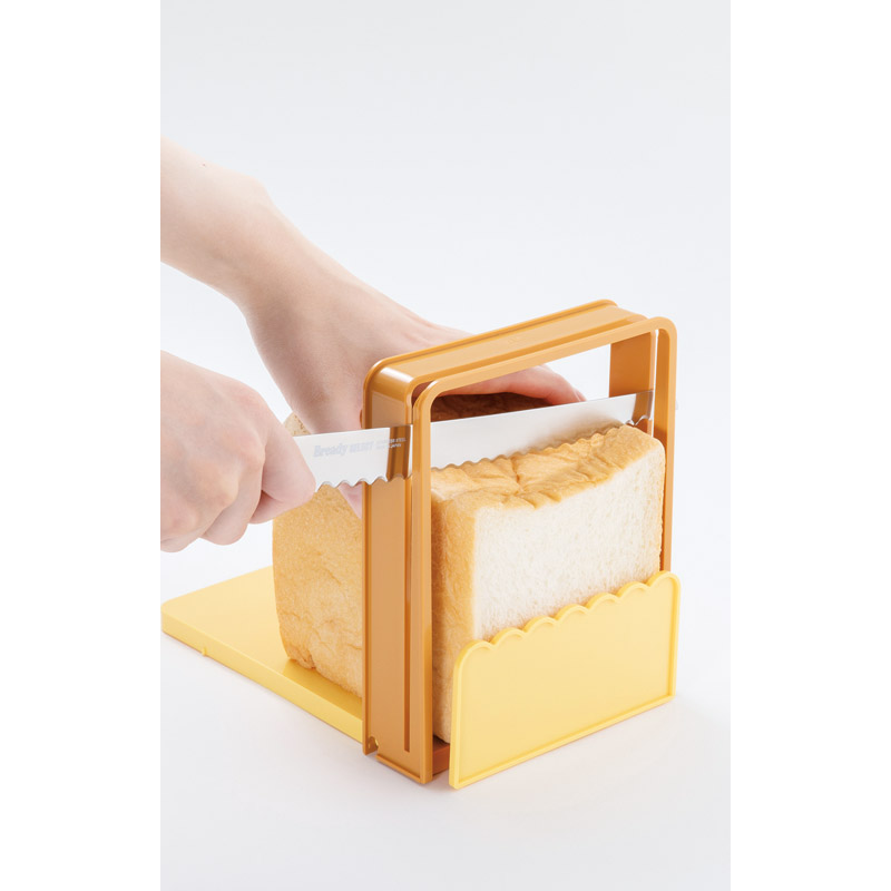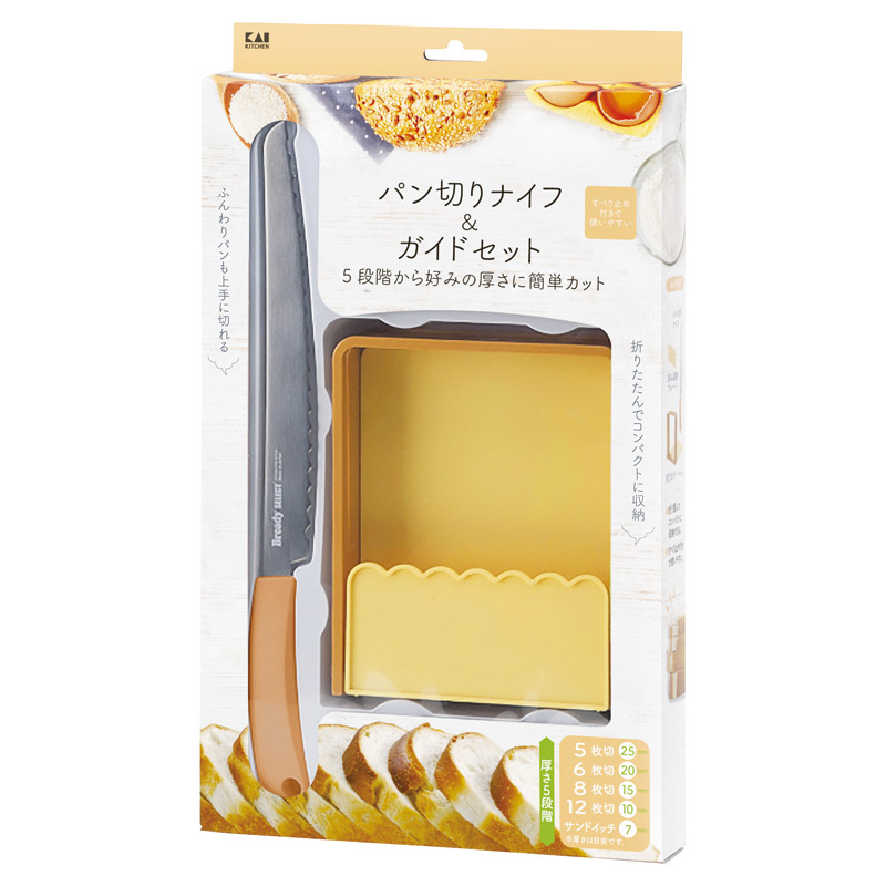 焼きたてふかふかのパンもきれいに切れるパン切りナイフと、5段階から好みの厚さで均等に切れるガイドのセットです。