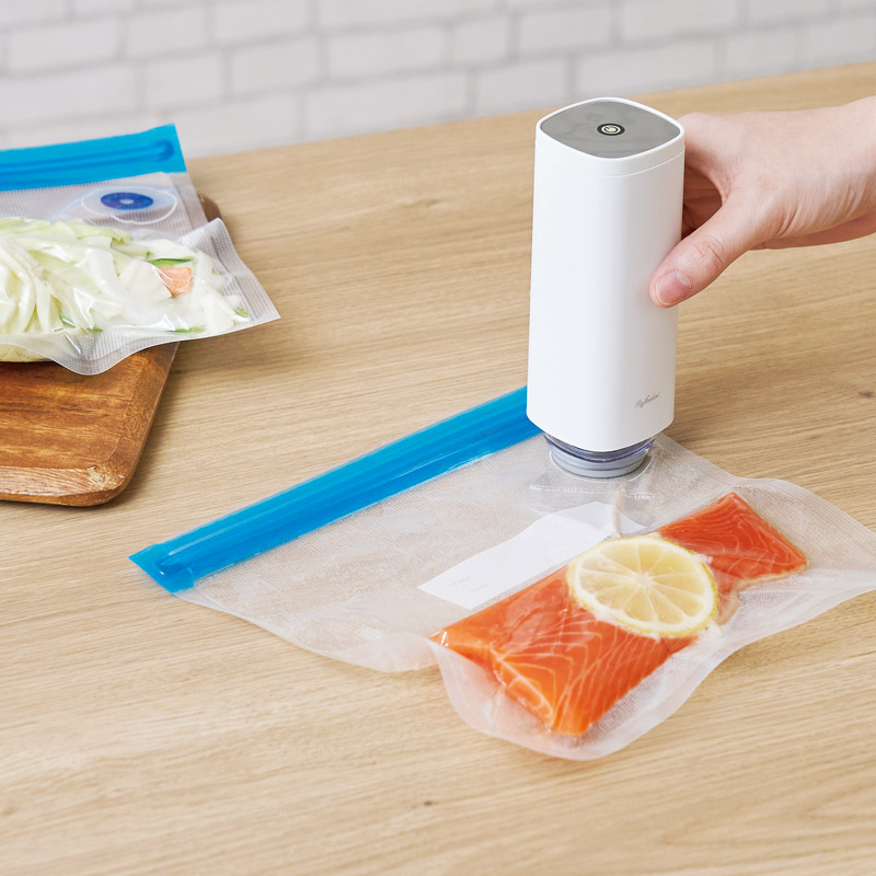 | コピー | ボタン1つの楽々操作で、およそ60Kpaの強力な吸引力であっという間に内部を真空にします。高い密閉力を備え、時間が経過しても空気が入りにくく長く保存できます。◎真空度:60Kpa(±10Kpa)◎約50秒でオートオフ |